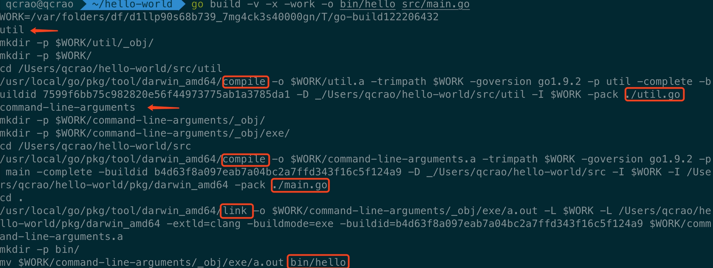 同时,用红框圈出了 compile, link,也就是先编译了 util 包和 main.go