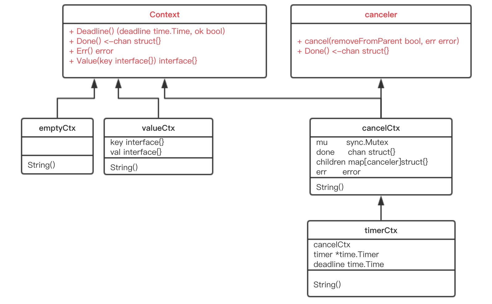 实现了上面定义的两个方法的 Context,就表明该 Context 是可取消的。源码中有两个类型实现了 canceler 接口:*cancelCtx