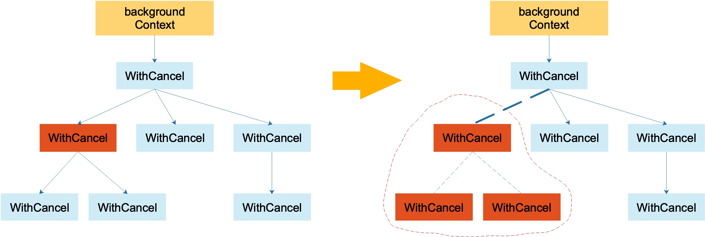 // 原因是一旦父节点超时,自动调用 cancel 函数,子节点也会随之取消。