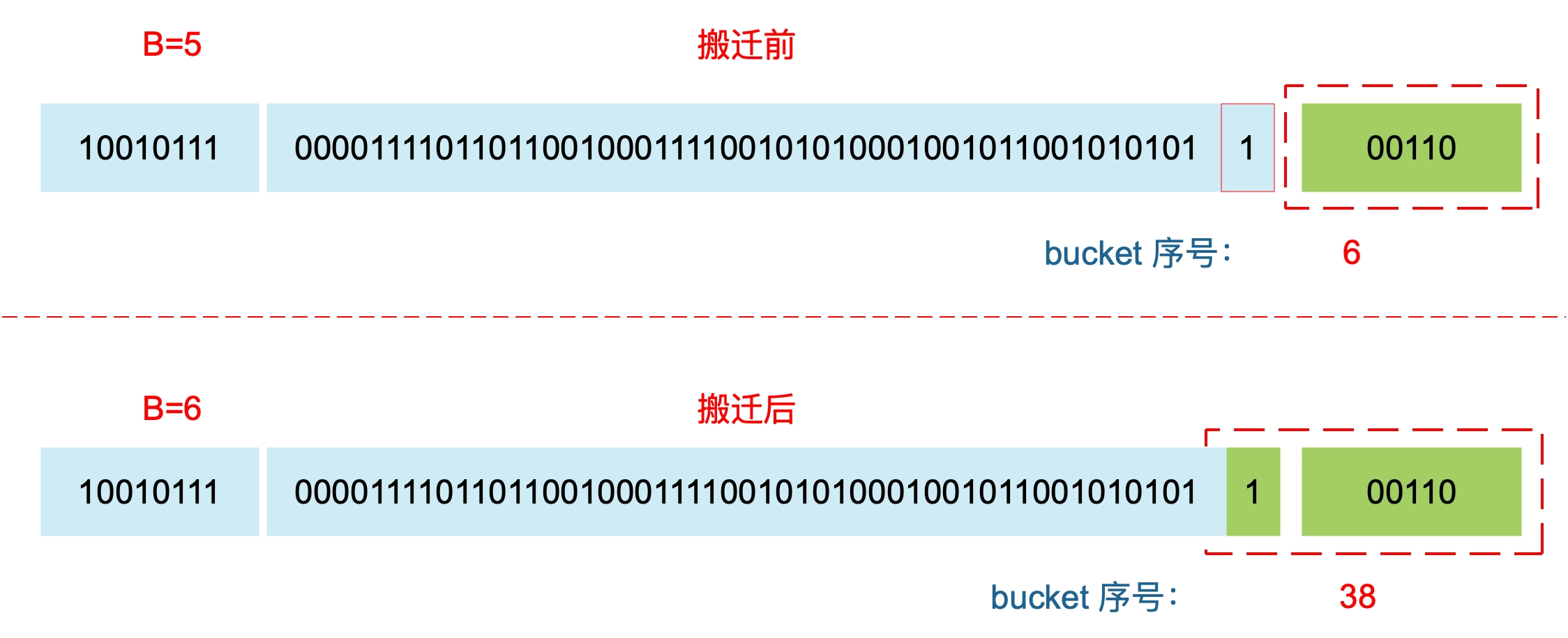 例如,原始 B = 2,1号 bucket 中有 2 个 key 的哈希值低 3 位分别为:010,110。由于原来 B = 2,所以低 2 位 10